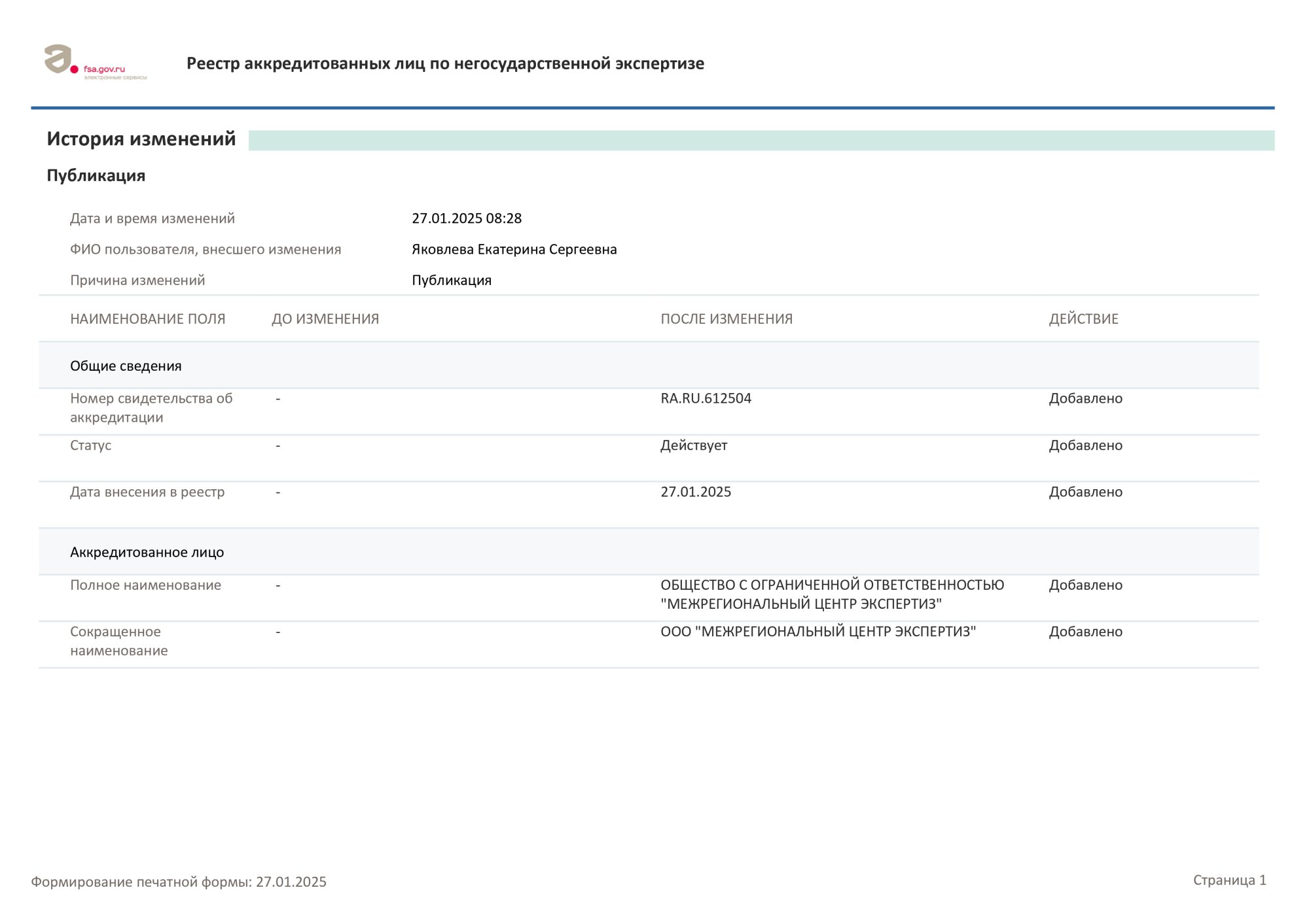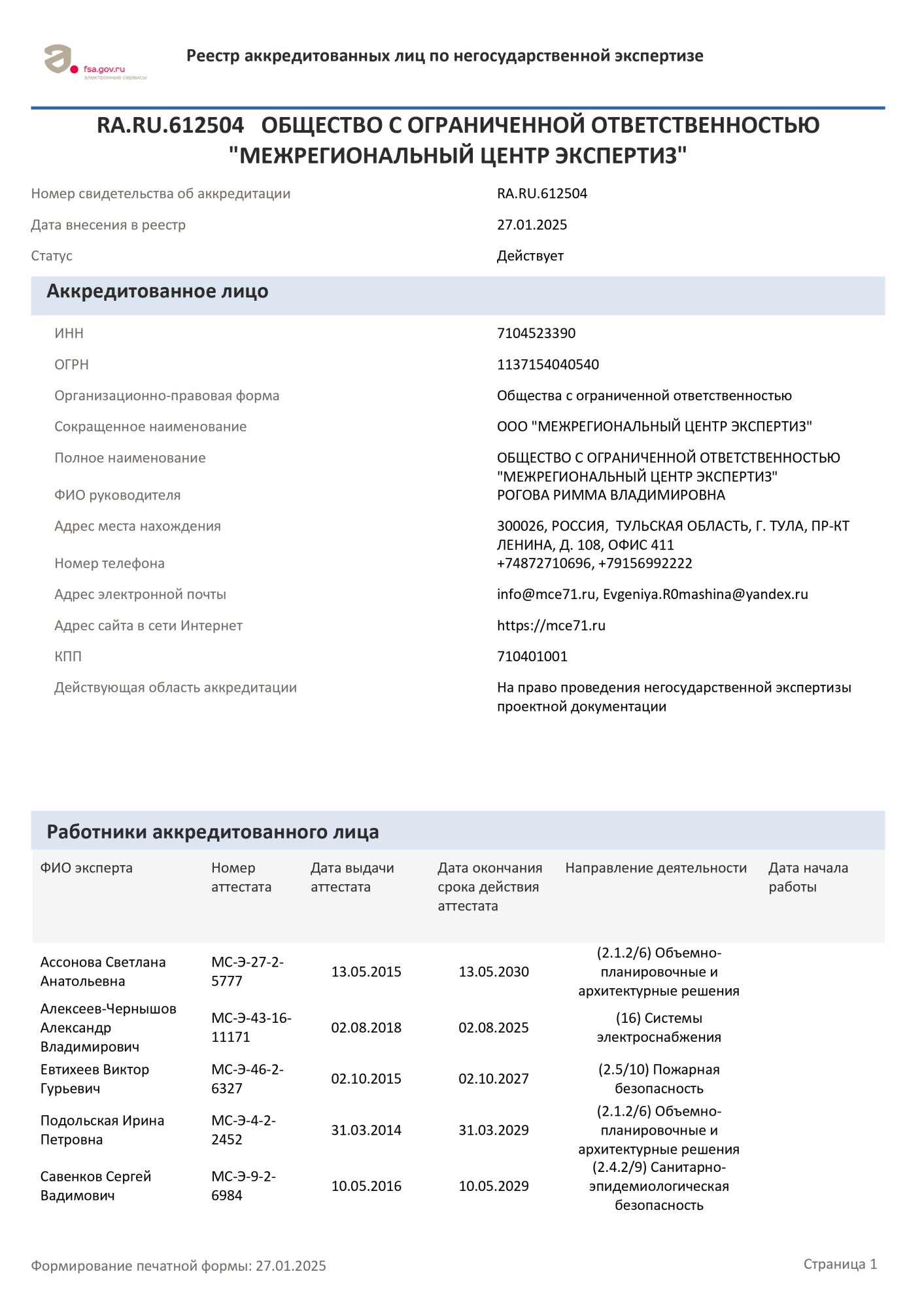 Аккредитация на право проведения негосударственной экспертизы результатов инженерных изысканий, выданное Федеральной службой по аккредитации № RA.RU.612504 от 27.01.2025. страница 1