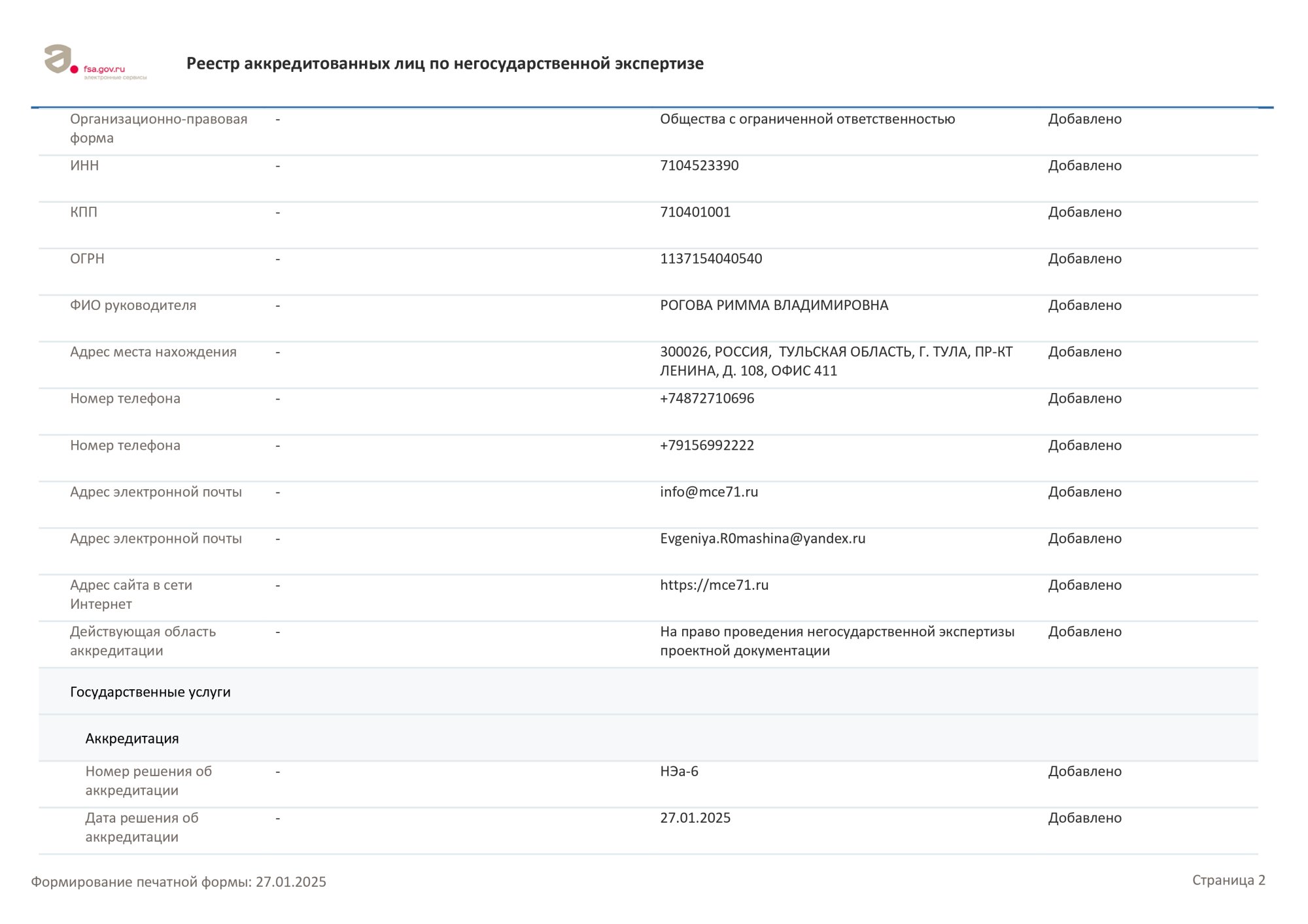 Аккредитация на право проведения негосударственной экспертизы результатов инженерных изысканий, выданное Федеральной службой по аккредитации № RA.RU.612504 от 27.01.2025. страница 2