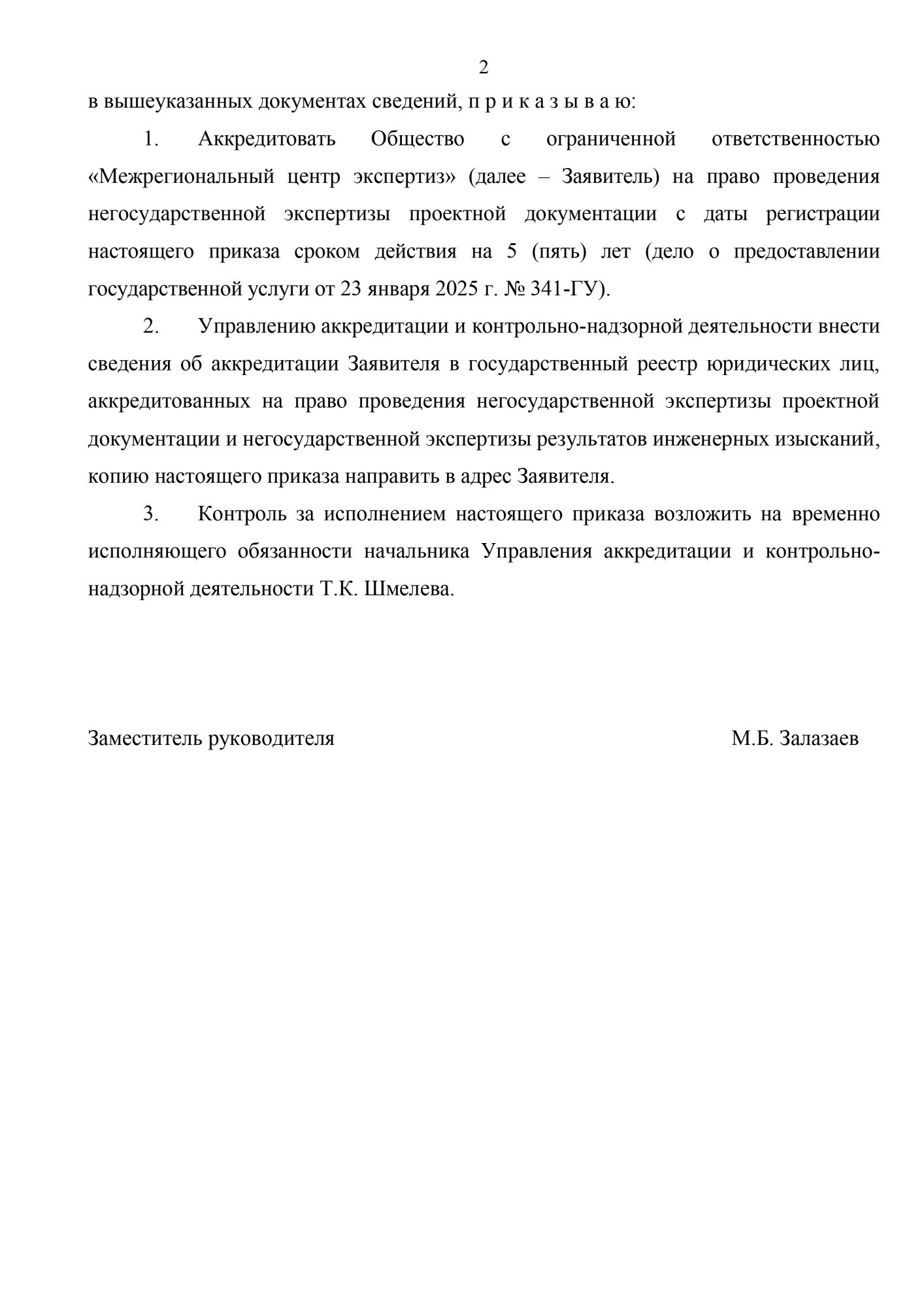 Приказ об аккредитации Общества с ограниченной ответственностью «Межрегиональный центр экспертиз» на право проведения негосударственной экспертизы проектной документации №НЭа-6 от 27.01.2025. страница 1