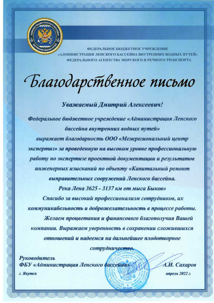 Федеральное бюджетное учреждение «Администрация Ленского бассейна внутренних водных путей» выражает благодарность ООО «Межрегиональный центр экспертиз» за проведенную на высоком уровне профессиональную работу по экспертизе проектной документации и результатов инженерных изысканий по объекту «Капитальный ремонт выправительных сооружений Ленского бассейна. Река Лена 3625-3137 км, от мыса Быков».